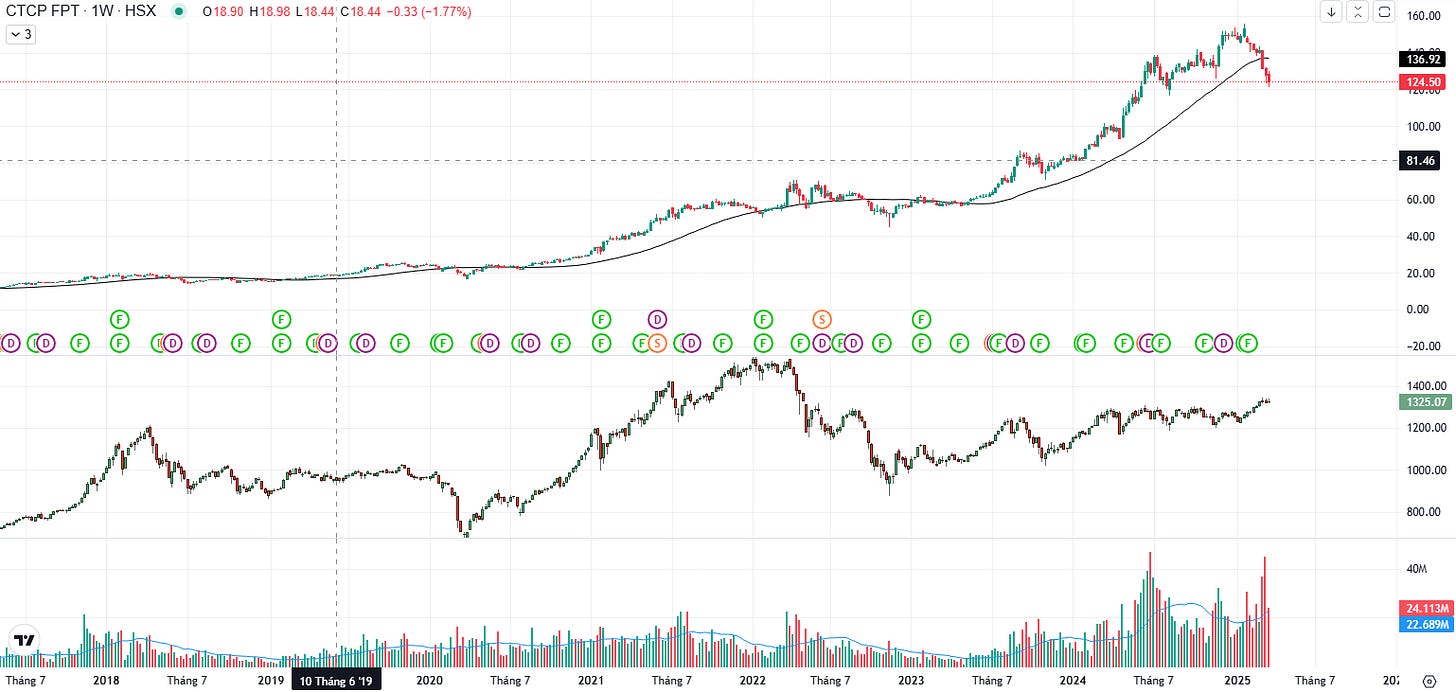 Suốt nhiều năm, FPT luôn là hình mẫu hoàn hảo của một cổ phiếu tăng trưởng bền vững. Từ 2020 đến nay, cổ phiếu này gần như chưa từng underperform so với VN-Index ở chu kỳ trung hạn. Mỗi khi thị trường rung lắc, FPT luôn là nơi trú ẩn, là “phao cứu sinh” của nhà đầu tư.