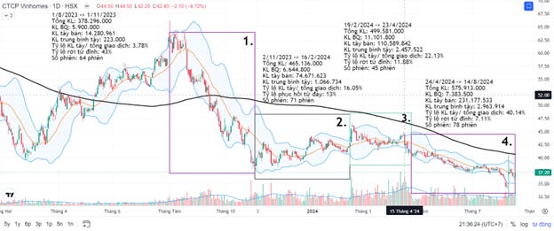 Biên độ giá đỉnh-đáy lên đến 43%, kèm theo đó là khối lượng nước ngoài bán ròng hơn 14.2 triệu cổ phiếu. Áp lực bán mạnh khiến nhiều nhà đầu tư cá nhân chịu thiệt hại, khiến tâm lý thị trường trở nên e dè, đặc biệt khi VHM đang ở thế sườn dốc giảm giá.