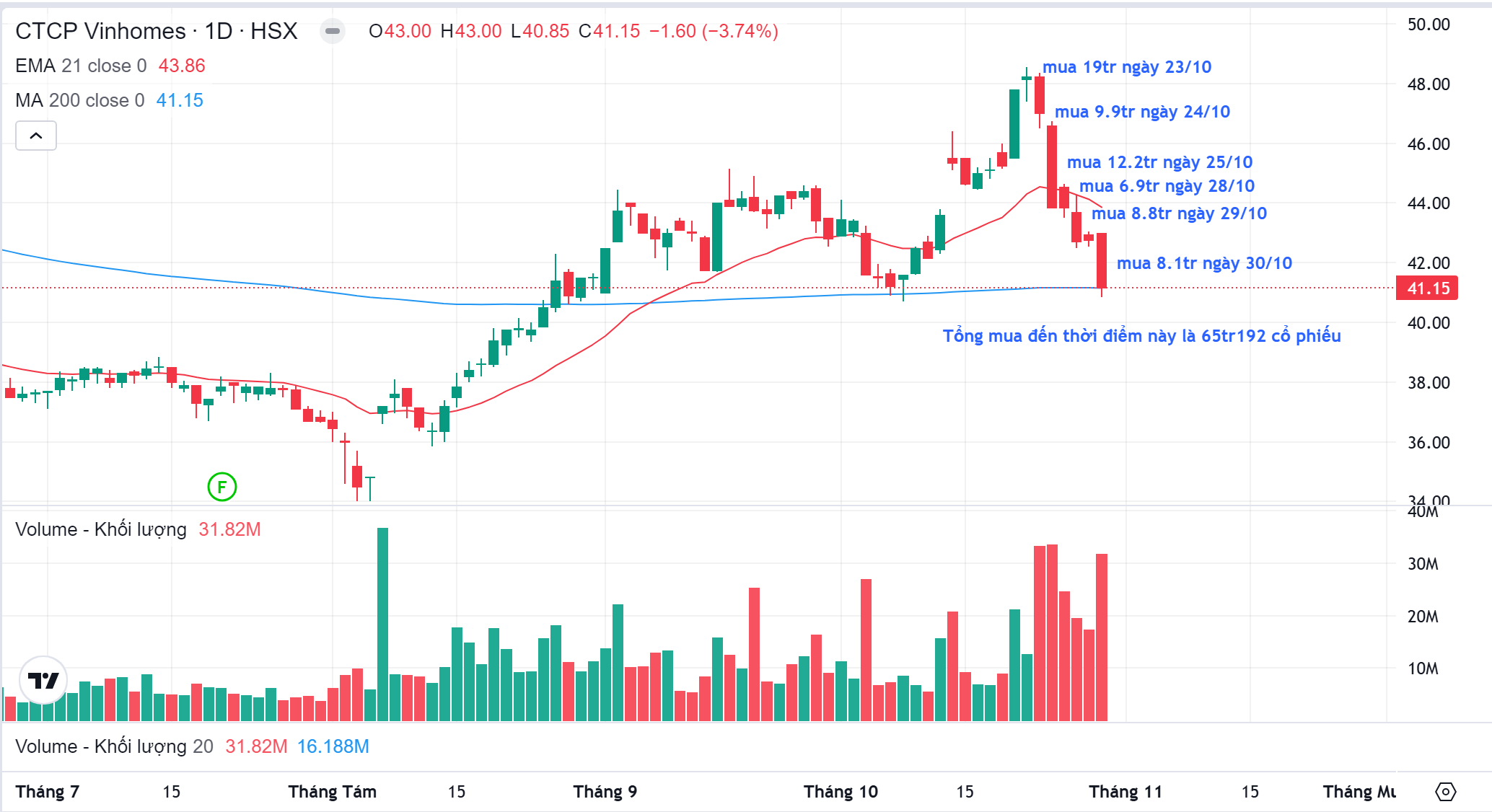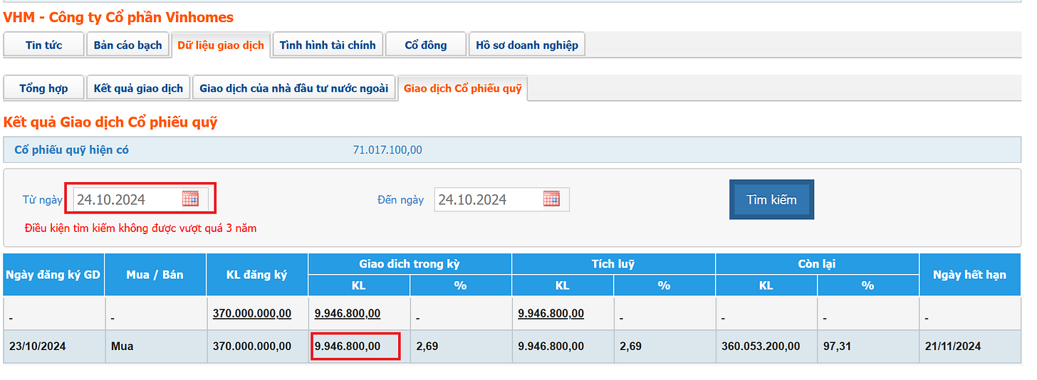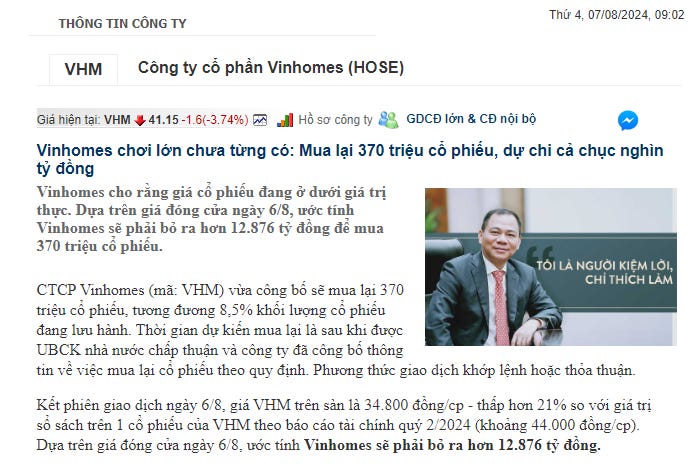 Ngày 23/10/2024, Vinhomes (VHM) công bố chính thức kế hoạch mua lại 370 triệu cổ phiếu quỹ, một động thái đáng chú ý trong bối cảnh cổ phiếu đang chịu áp lực giảm giá. Nhưng câu hỏi đặt ra: Liệu đây có phải là cơ hội tốt cho nhà đầu tư bắt đáy và tham gia vào "game" mua lại cổ phiếu của doanh nghiệp? Trước khi đưa ra quyết định, hãy cùng phân tích chi tiết hành động giá cổ phiếu và tín hiệu thị trường qua các giai đoạn gần đây.