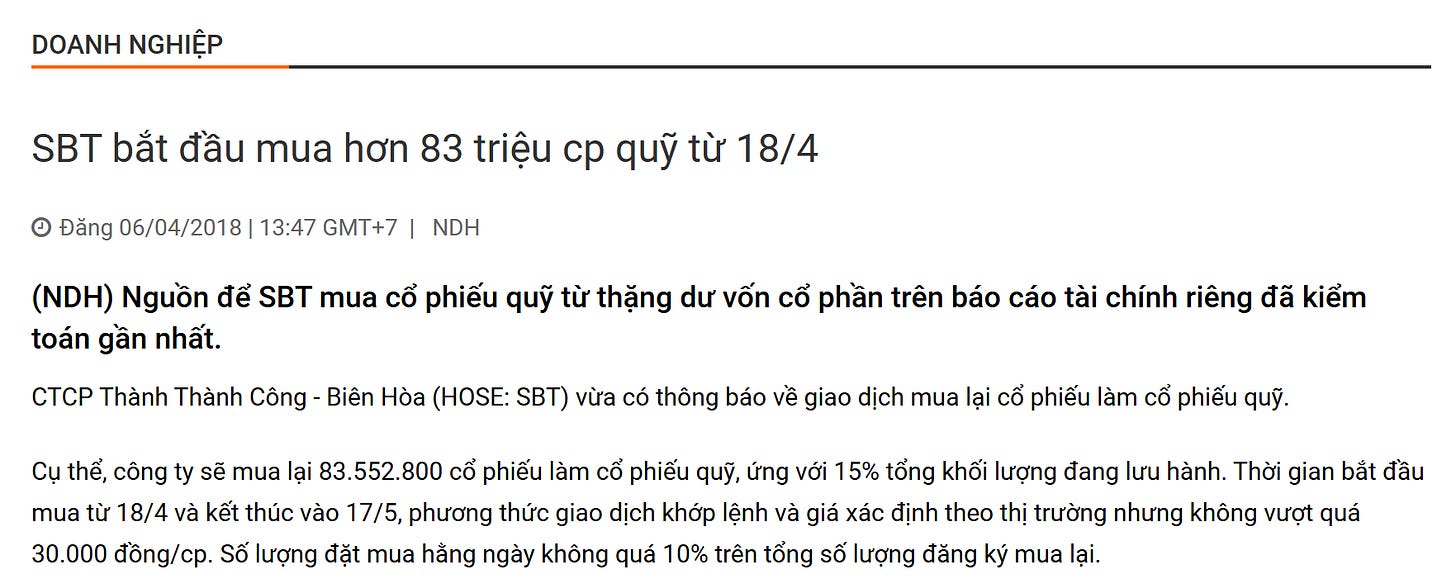 Trước đây, SBT cũng từng triển khai mua lại cổ phiếu quỹ từ thặng dư vốn, song kết quả cho giá của SBT trở nên bất ổn sau đó, hầu hết nhà đầu tư mua vào theo tin tức đều gặp khó khăn. Sự tương đồng giữa SBT và VHM hiện tại cho thấy rủi ro là lớn nếu nhà đầu tư chỉ dựa vào yếu tố mua lại cổ phiếu quỹ.