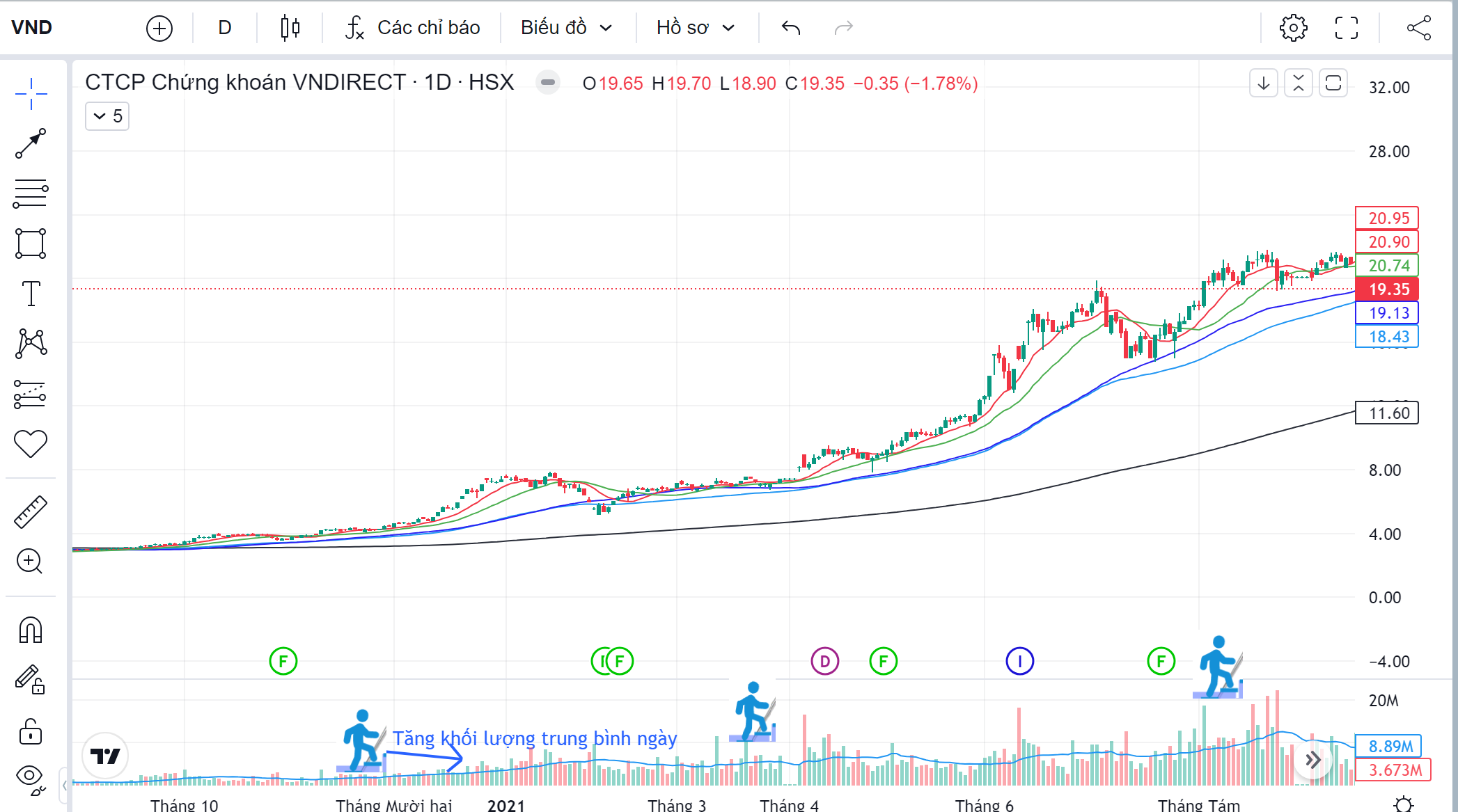 Nhưng khi bạn thấy Khối lượng trung bình hàng ngày tăng lên, đây là dấu hiệu của sự quan tâm và tham gia của tổ chức đối với một cổ phiếu bắt đầu tăng dần lên có thể là do họ đã thay đổi góc nhìn cũng như định giá lại cổ phiếu, từ đó dẫn tới những bước chuyển mình tiếp theo trong hành động giá.